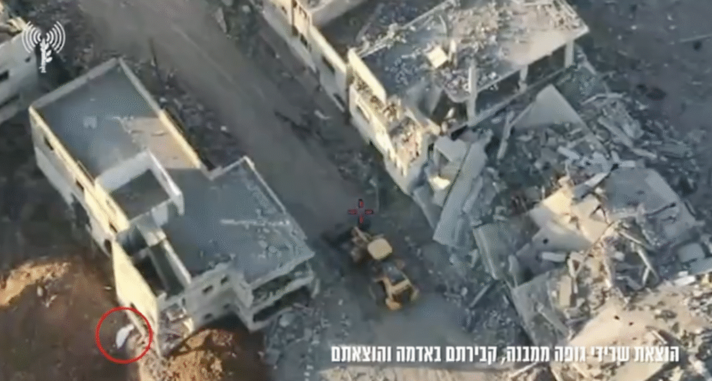 חמאס הודיע שיעביר ערב חלל חטוף נוסף – זמן קצר לאחר מכן נרשמה הפרה חמורה: ירי לעבר כוח צה״ל בדרום הרצועה. תיעוד מרחפן צה״לי חשף הצגה מבוימת: מחבלי חמאס קברו שקית עם שרידי אופיר צרפתי ז״ל ואז “חילצו” מול הצלב האדום. בישראל דנים בסנקציות: צמצום סיוע הומניטרי, השתלטות על אזורים מעבר ל״קו הצהוב״, או חידוש האש; טרם הוחלט. לפי ההסכם חמאס התחייב להשיב כל החטופים בתוך 72 שעות: הוחזרו 20 חיים ו-15 חללים; 13 חללים נותרו. תמונה דובר צה״ל